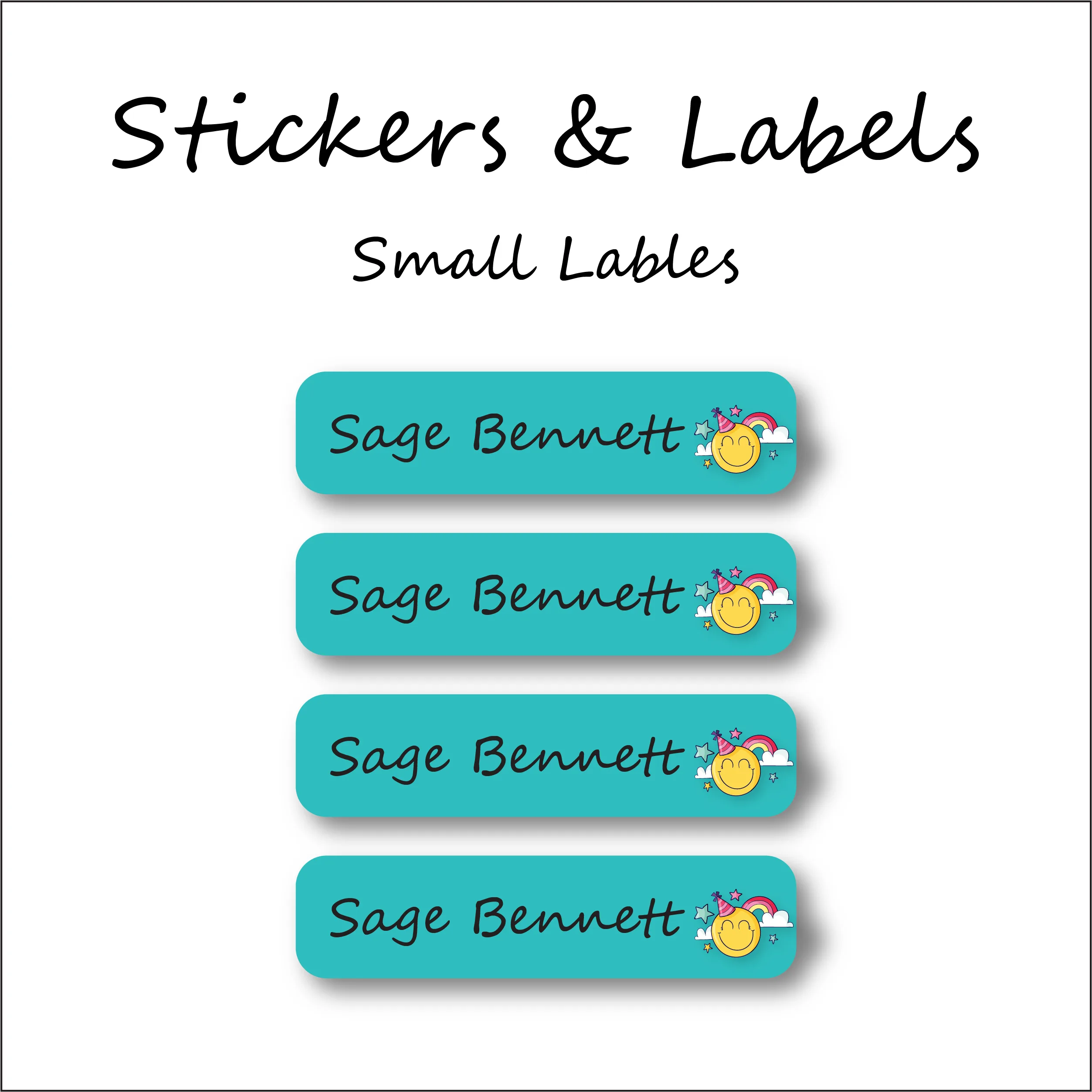 These personalized kid name labels will stick around for the long haul- we’ve designed them to be durable and long-lasting! We make all our kid Birthday Smiley name labels for camp and school with top-quality materials and use eco-friendly ink. Simply customize with your child’s name and leave the rest to us. With our name stickers for kids, you won’t have to worry about your child losing their belongings again!