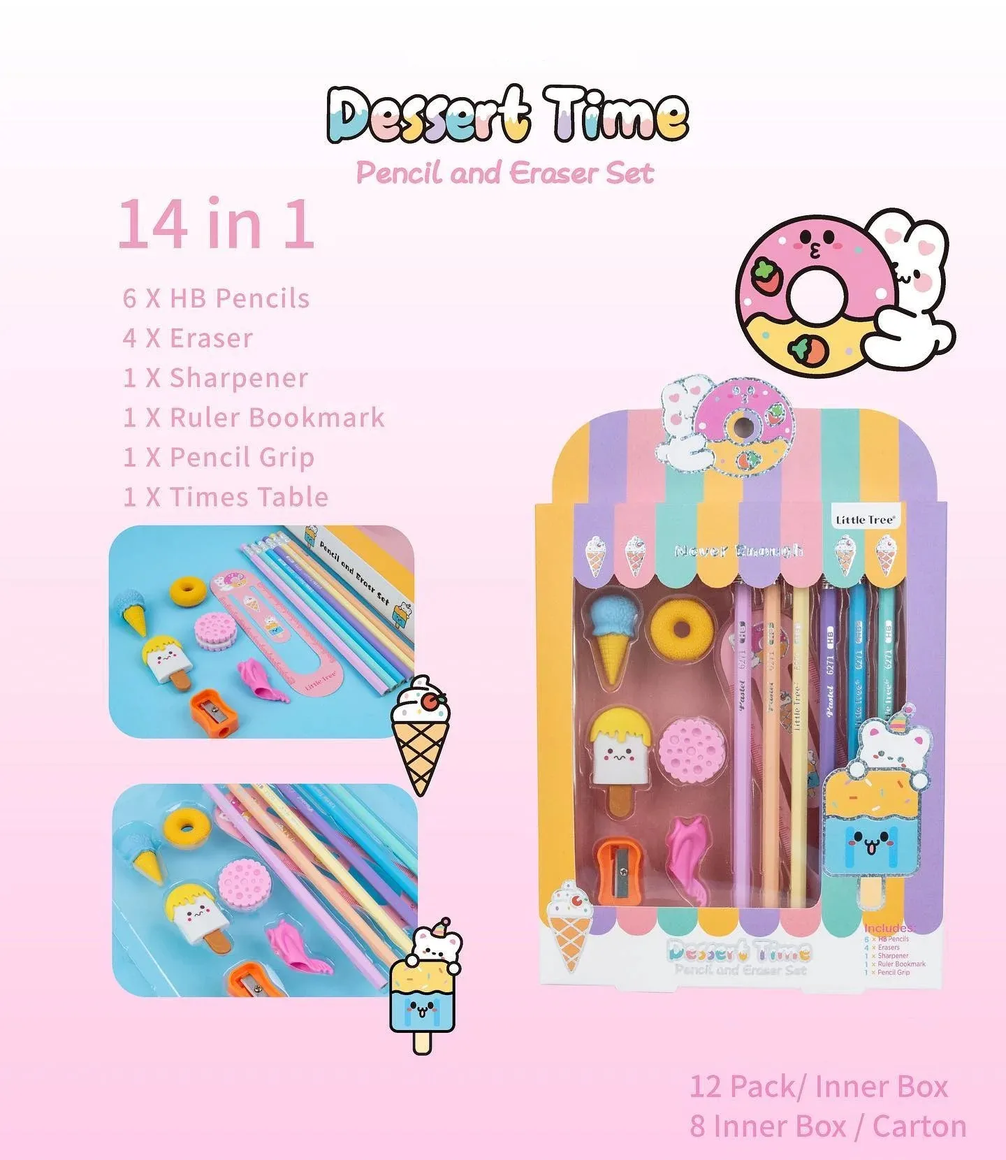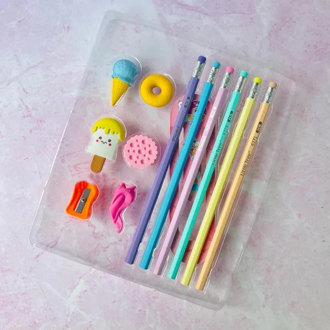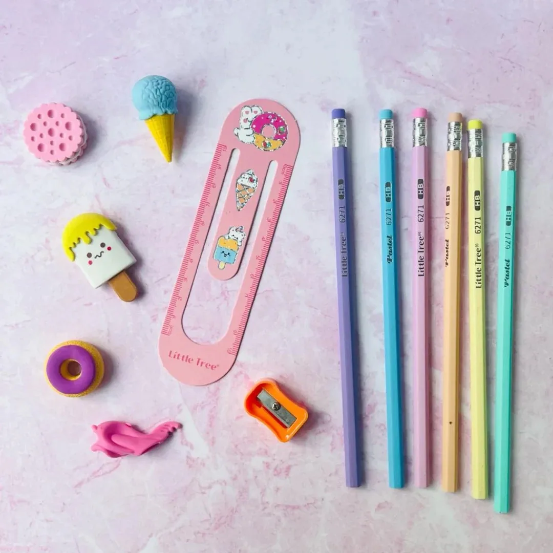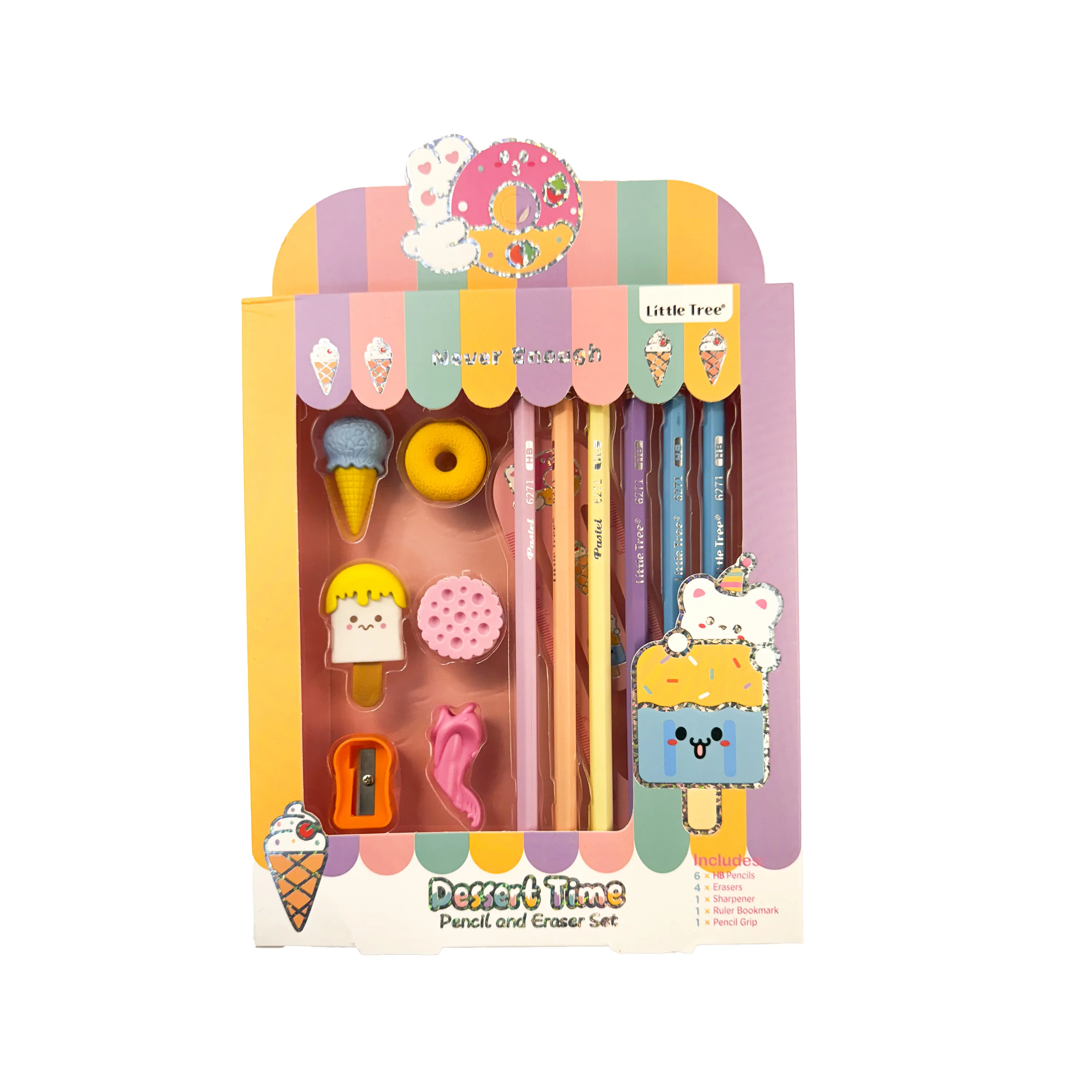 - Complete set- This dessert theme stationery set includes everything your child needs to get started on their schoolwork or art projects, including 6 pencils, 4 erasers, 1 sharpener, 1 pencil gripper, and 1 bookmark ruler.