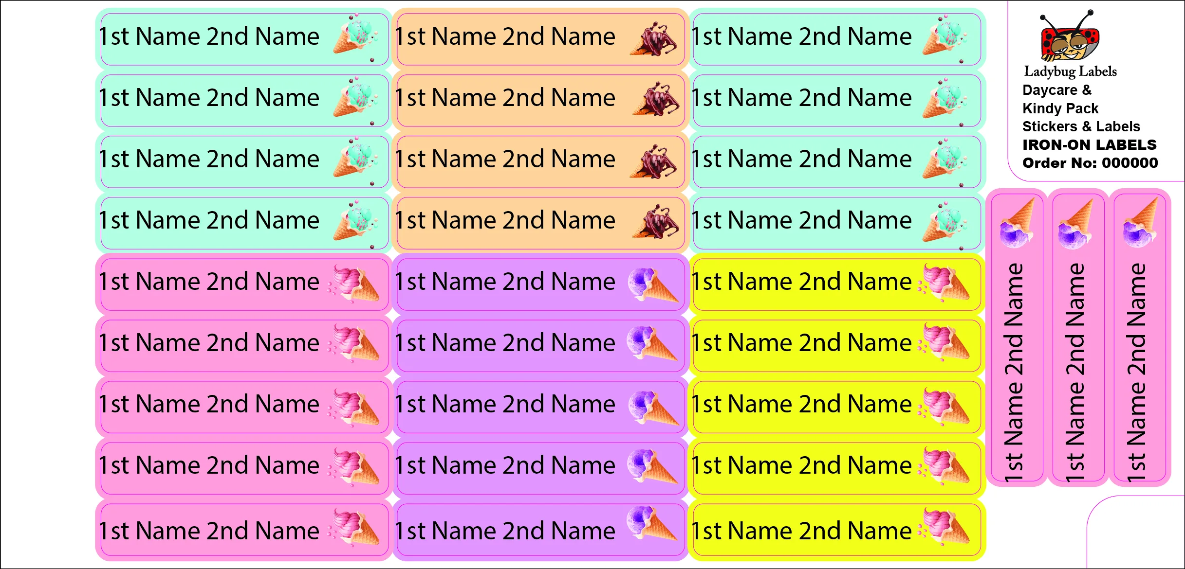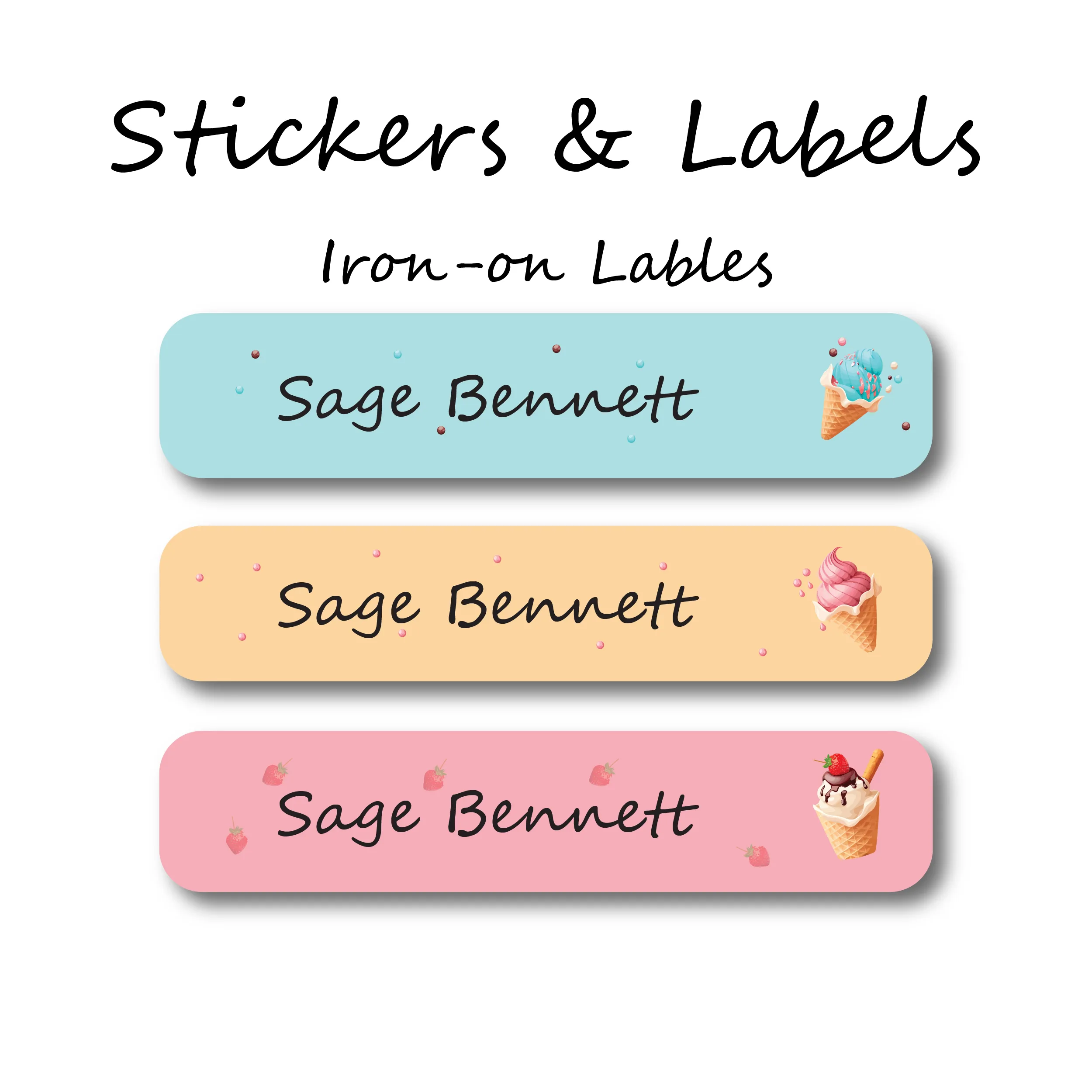 Our Ice Cream-Pack of 50 custom iron-on clothing labels pack comes with 50 iron-on name stickers for clothing.